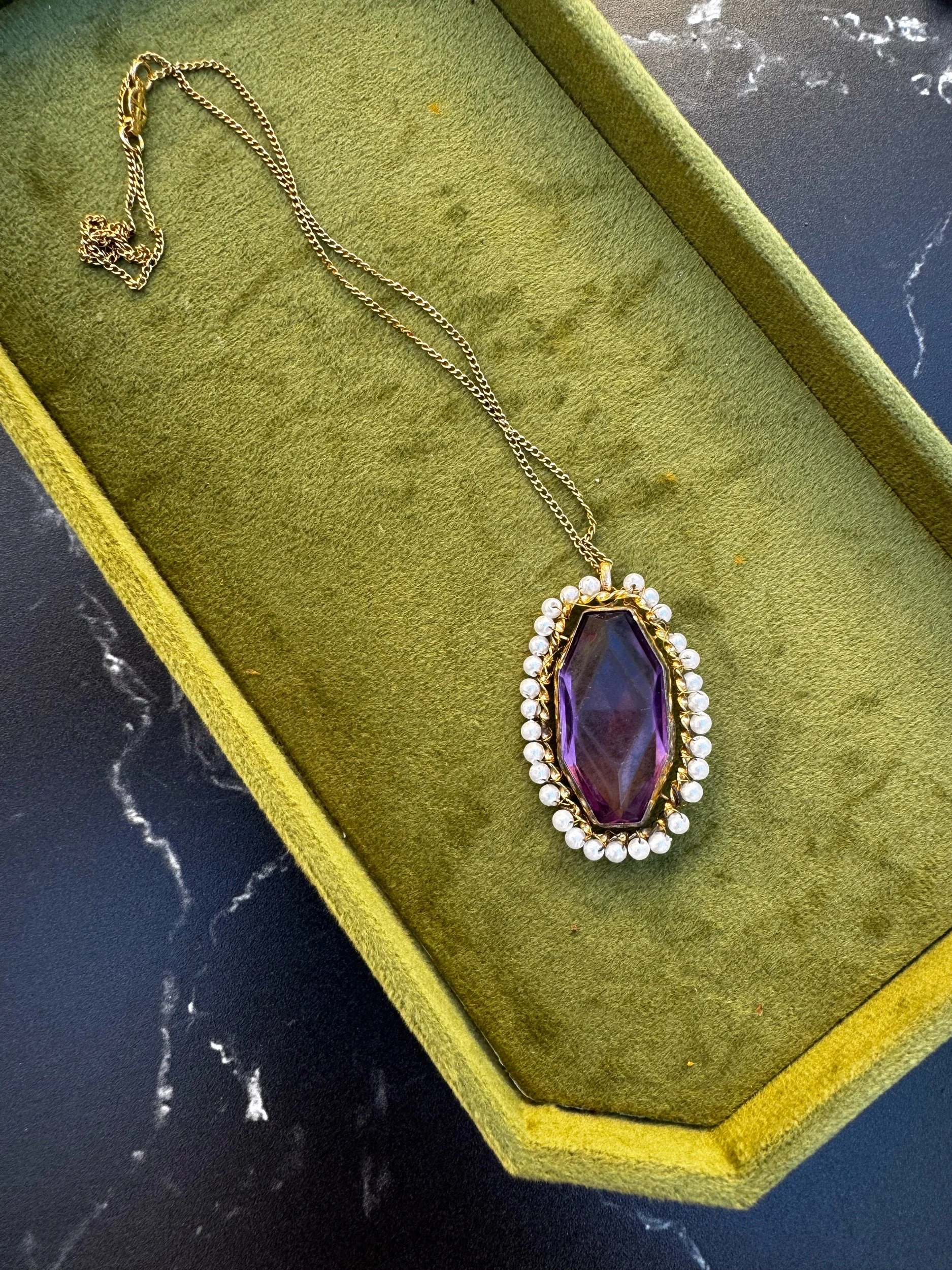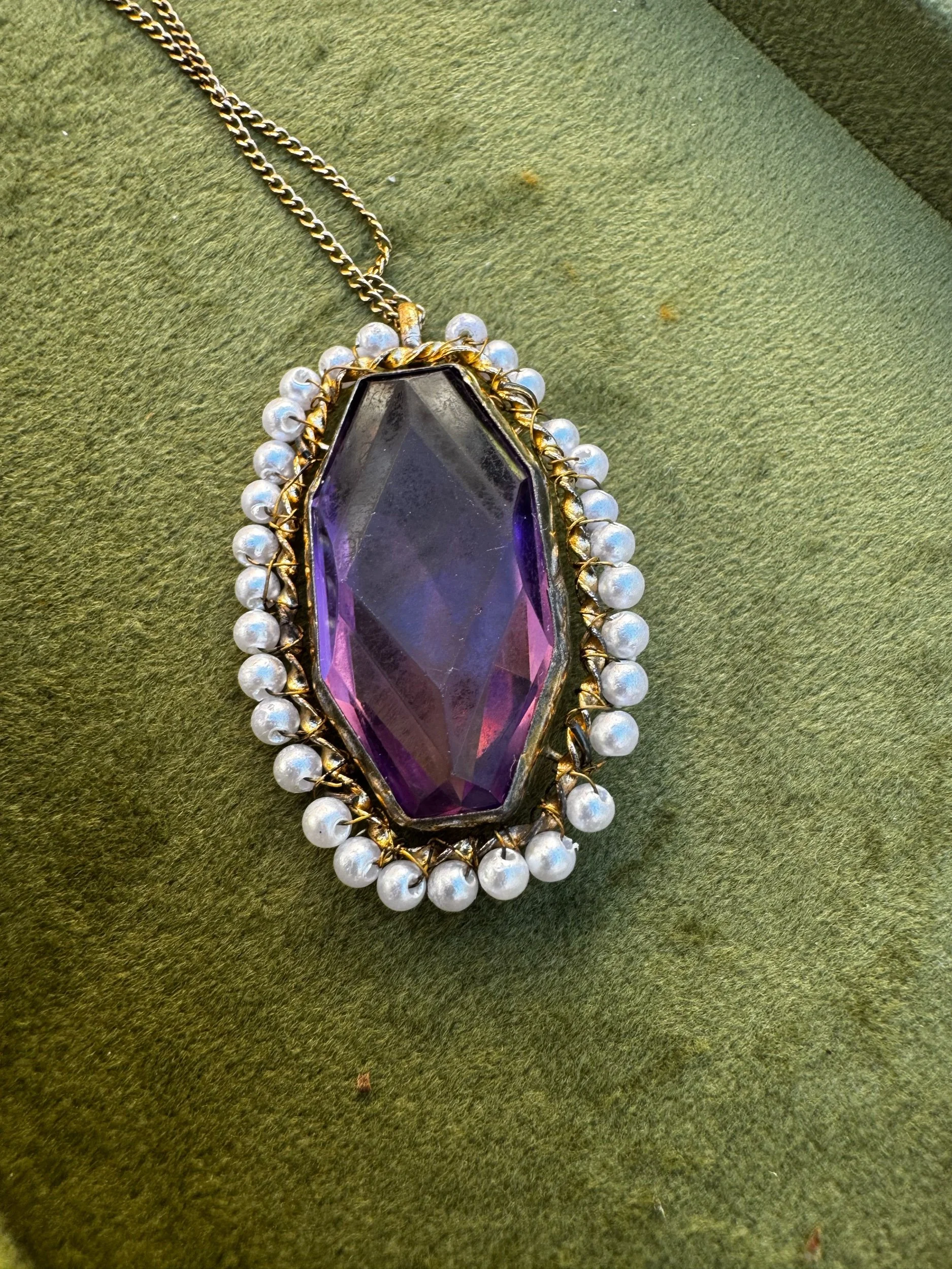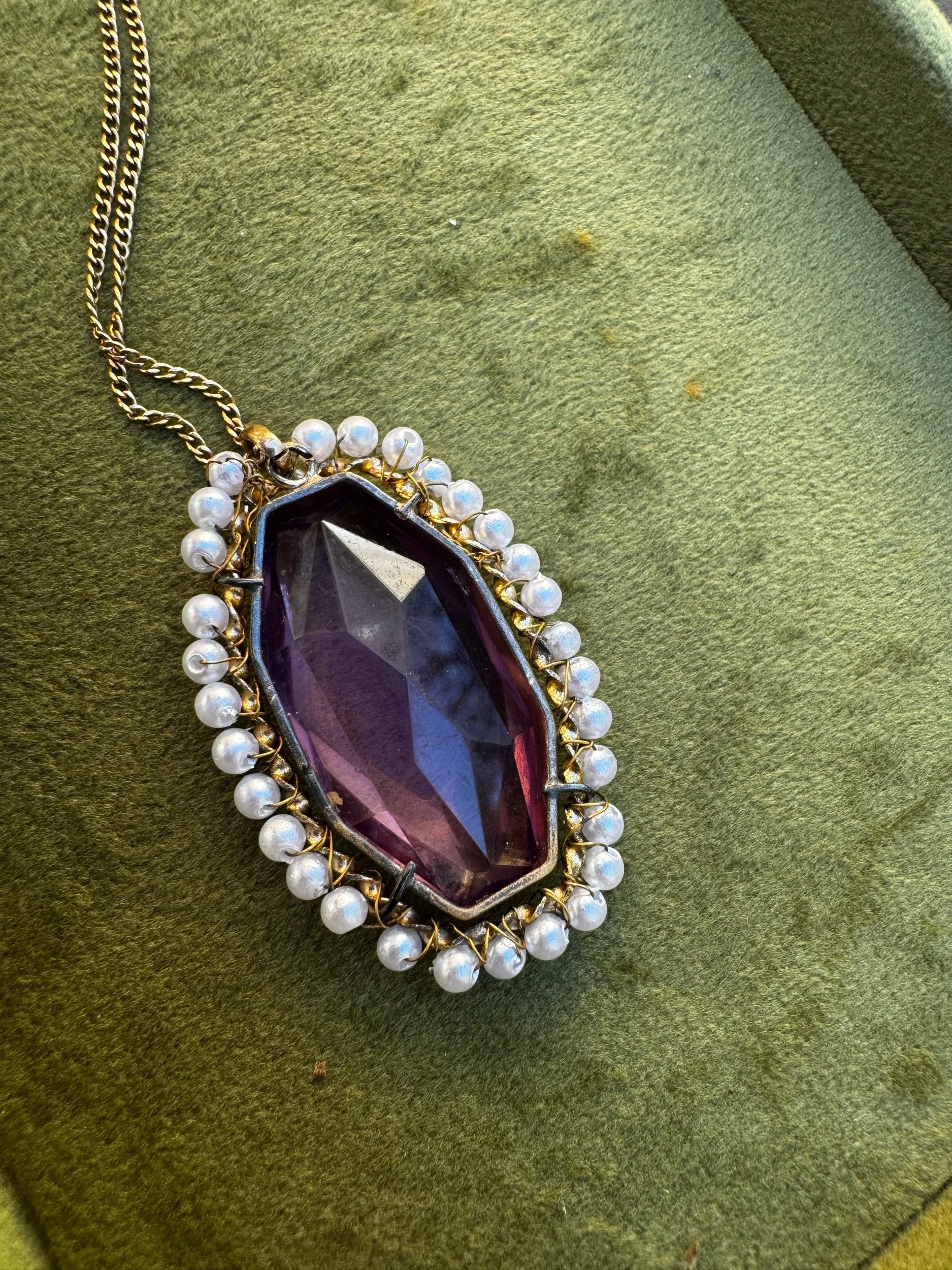 Antique Art Deco Purple Glass Faux Pearl Gold Filled Pendant Necklace 16 Inch Chain 1.75 Inch