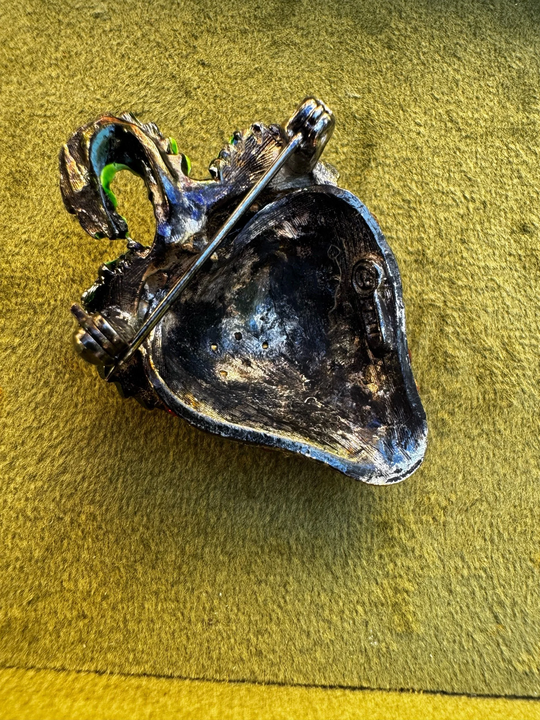 Vintage Pell Red Glass Rhinestone Green Enamel Strawberry Brooch Pin Silver Tone Japanned Metal 1.75“