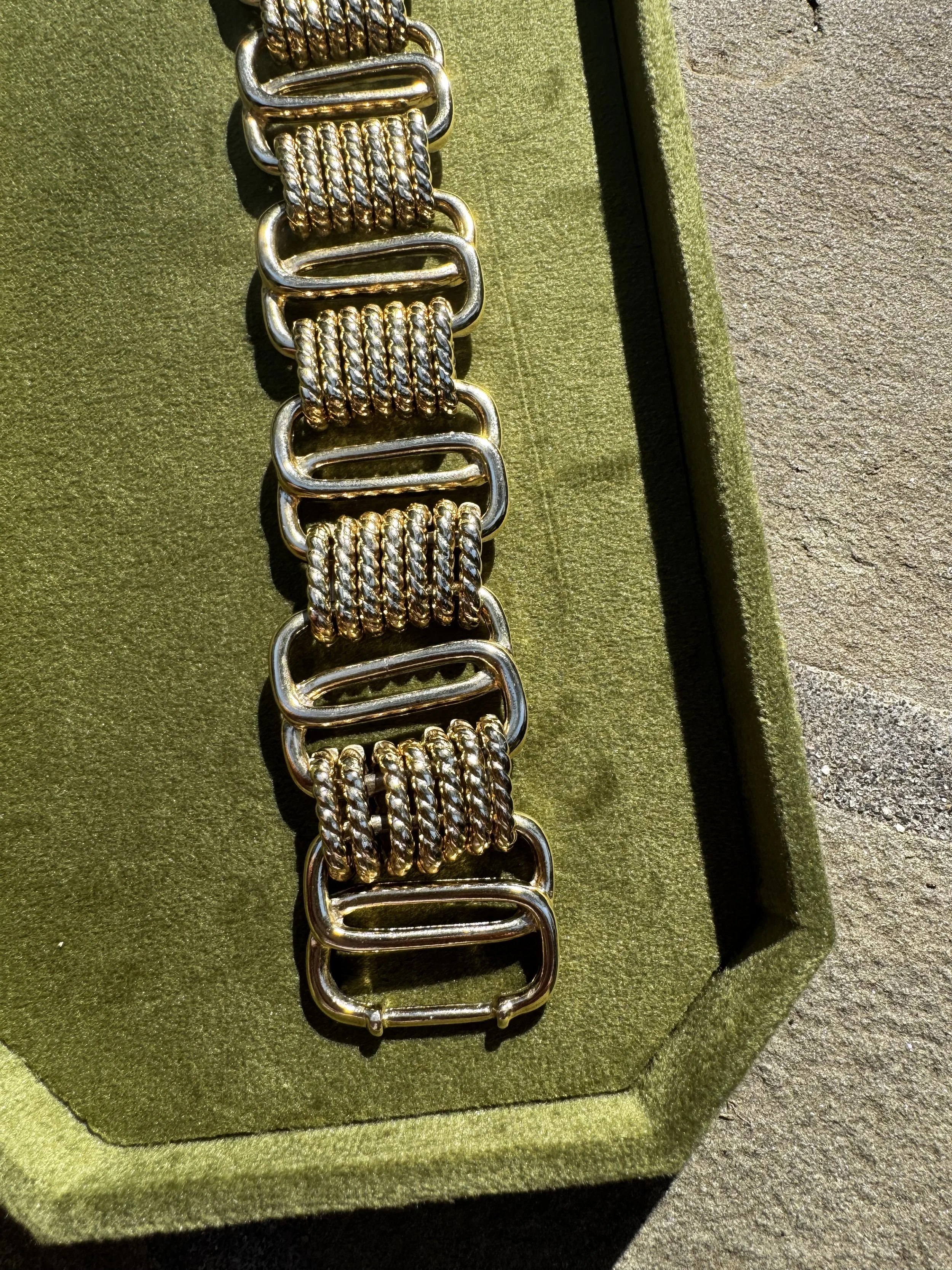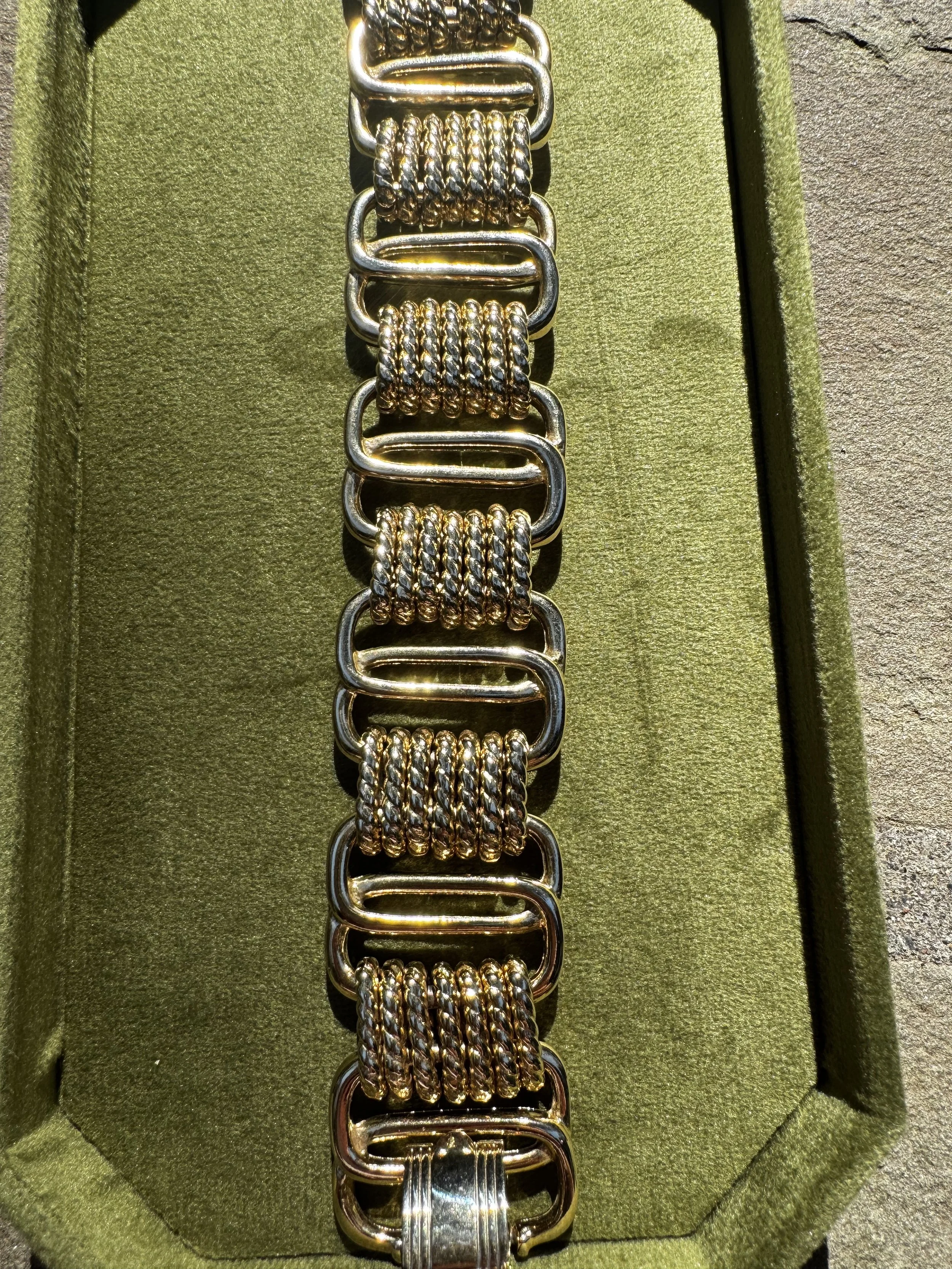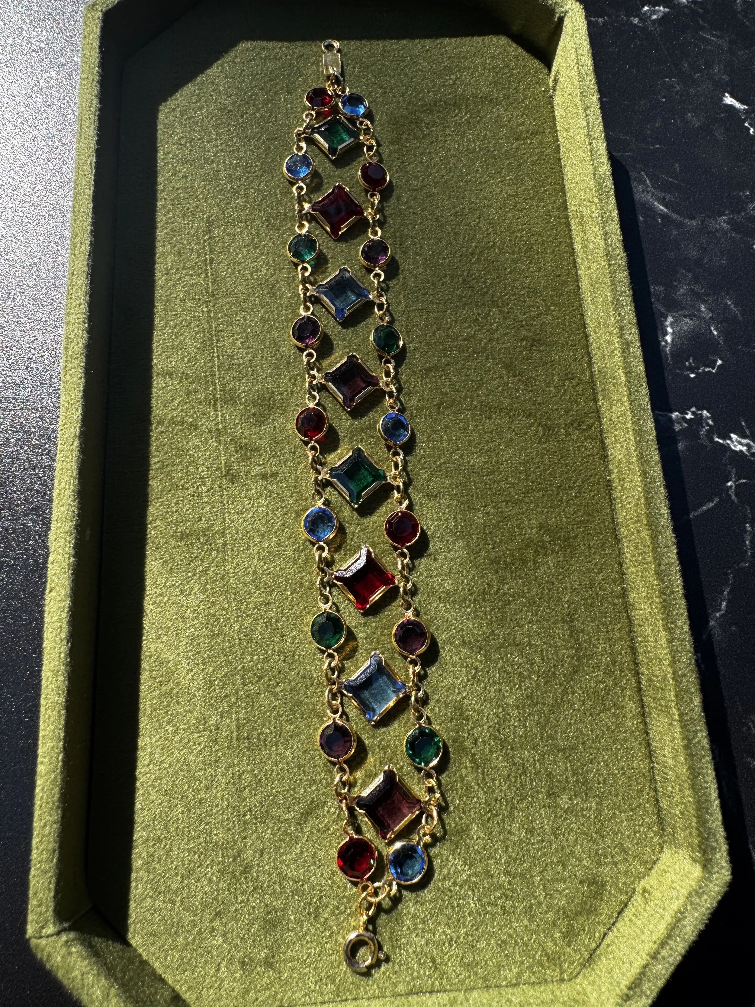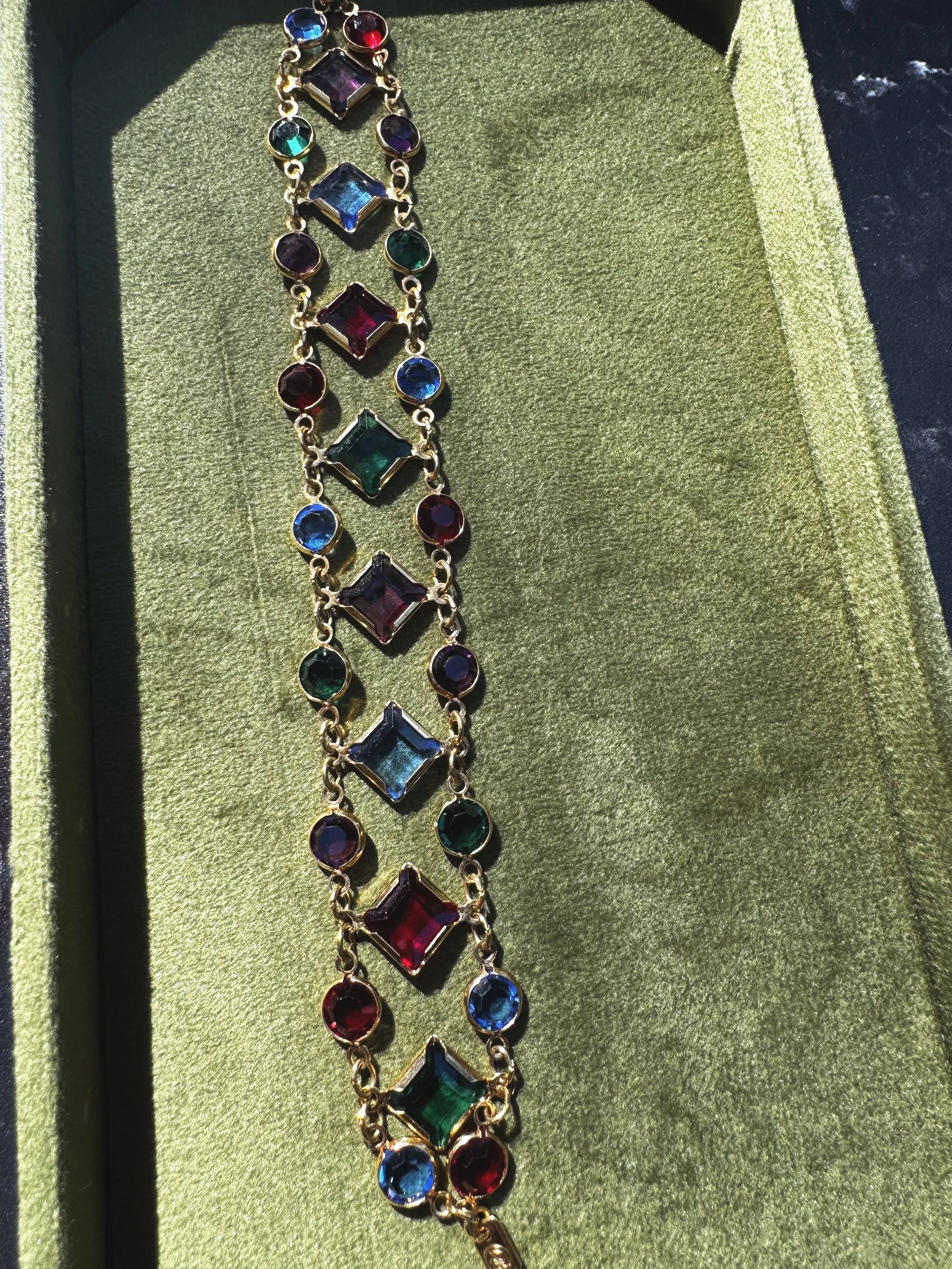 This rhinestone bracelet is a showstopper! She features a box clasp with a safety chain. Measures 6.5”. Circa 1950.