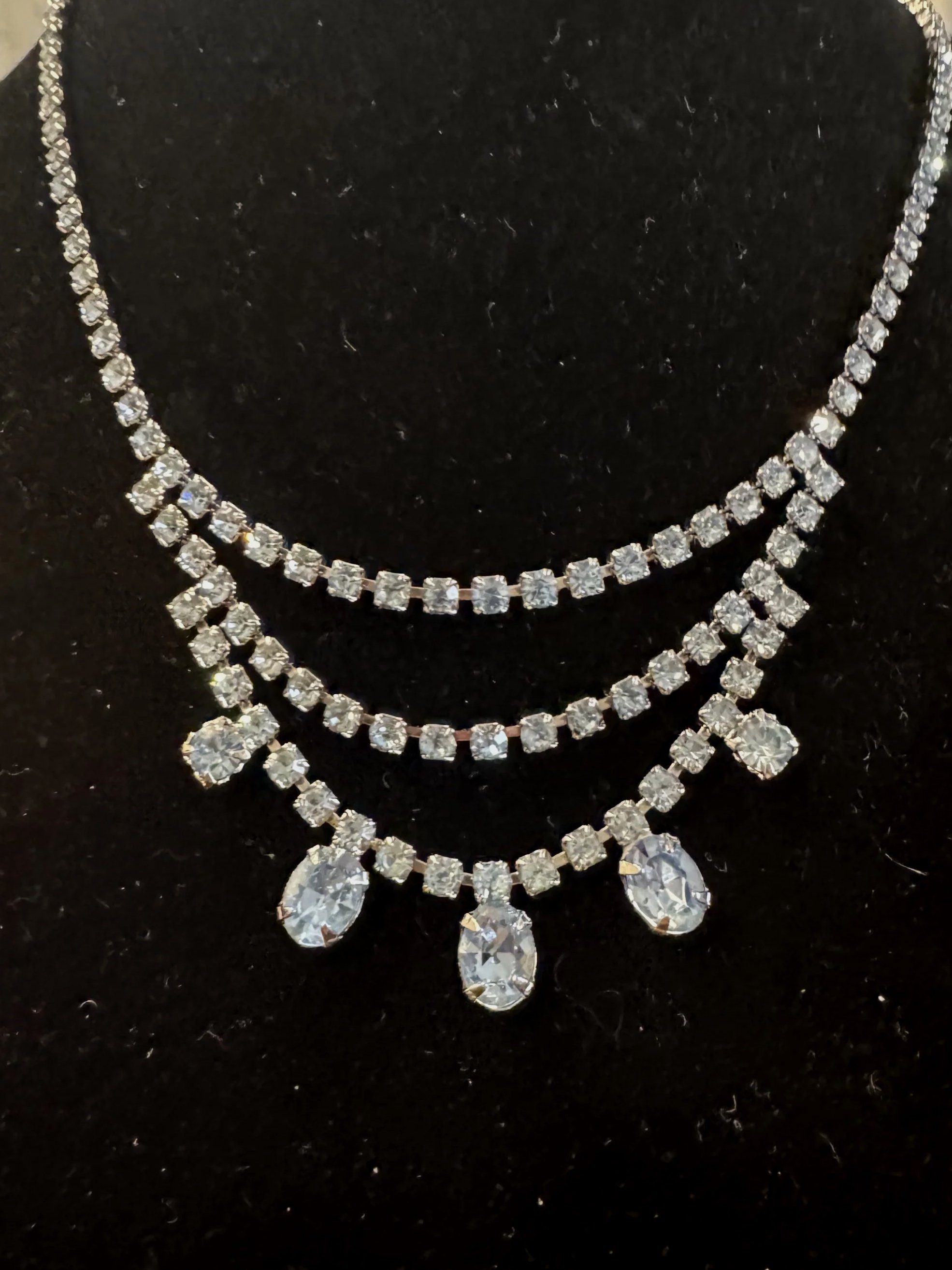 Color & Design: The necklace showcases a beautiful pattern of bright, robin's egg blue oval-shaped beads. These are interspersed with small, faceted clear crystal spacer beads that catch the light beautifully, adding a touch of sparkle and sophistication.